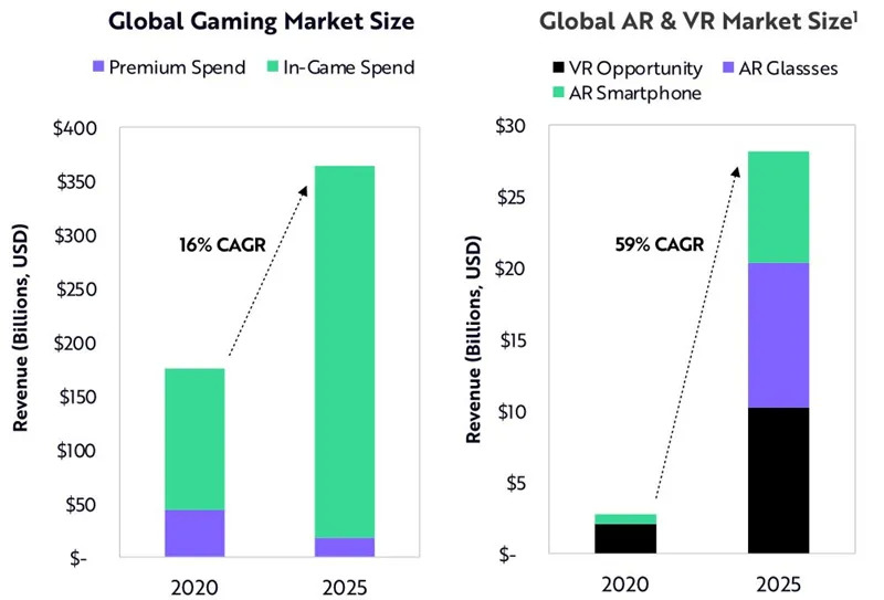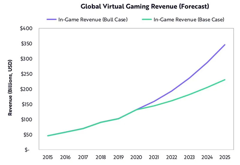 到2025年,虚拟世界的收入将接近4000亿美元。根据ARK的研究,全球游戏市场在未来5年将以16%的复合年增长率增长,从2020年的1750亿美元增长到2025年的3650亿美元。
