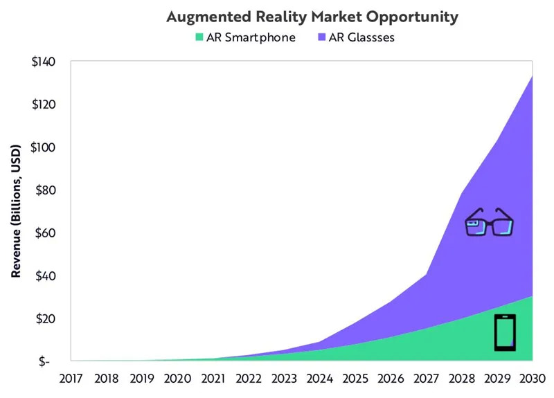 到2022年,消费级的AR耳机将助长这一趋势。ARK预测,到2030年,AR市场规模将从现在的不到10亿澳元扩大到1300亿美元。