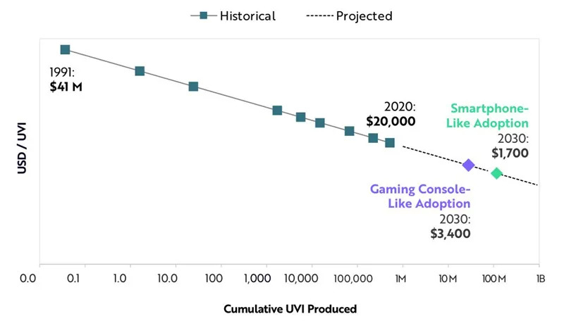 如果消费者虚拟现实仅限于掌机游戏市场,我们相信虚拟现实头盔将无法扩展到大众市场的人类沉浸能力。根据Wright定律,在与PC价格相当的情况下,完全的视觉沉浸感将要求VR头戴设备在2030年前遵循智能手机的使用曲线。