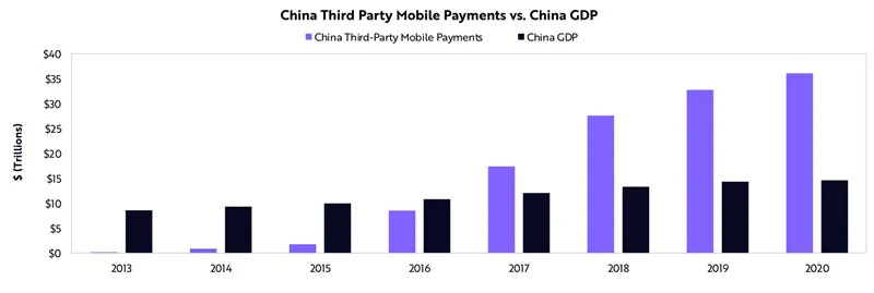移动支付在中国已经其GDP的2.5倍。在短短5年时间里,中国移动支付的规模增长了15倍以上,从2015年的约2万亿美元增长到估计的36万亿美元,几乎是中国2020年GDP的三倍。