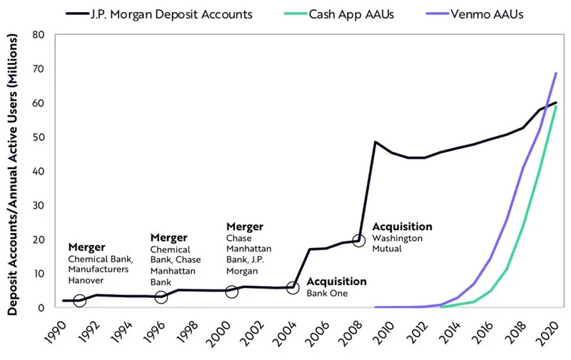 在美国,数字钱包用户的数量正在超过大型金融机构的存款账户持有者。Square的现金应用和PayPal的Venmo在过去7年和10年分别积累了约6,000万活跃用户,摩根大通用了30多年时间和5次收购才达到这一里程碑。截至2020年底,摩根大通存款账户持有者的总数约为6000万,而现金应用和Venmo的年度活跃用户(AAUs)分别增至5900万和6900万。