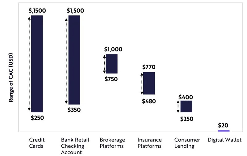 数字钱包能够以很小的成本来获取客户。数字钱包爆炸式增长的主要驱动力是较低的用户获取成本。ARK的研究显示,传统金融机构为获得一个新的支票账户客户可能需要支付约1000美元,而数字钱包的投资仅为20美元,这要归功于病毒式的点对点支付生态系统、精明的营销策略和大幅降低的成本结构。