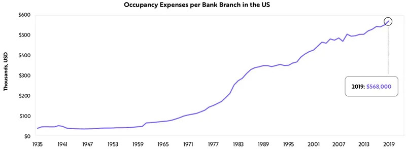 与此同时,银行机构的成本在上升,而它们的效用在下降。随着消费者放弃实体银行,转而青睐手机银行,银行分支机构的占用费用增加,2019年达到创纪录的56.8万美元。