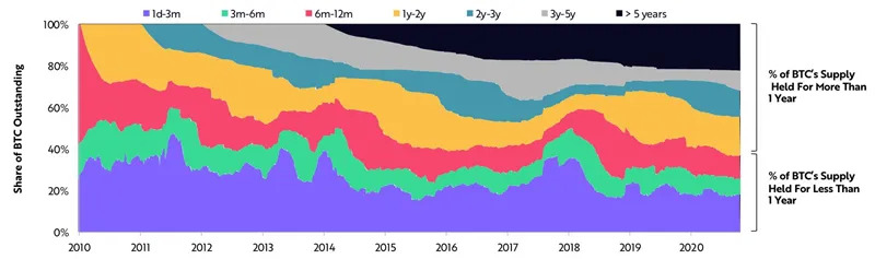 比特币的市场参与者从未像现在这样关注长期投资。截至2020年11月,大约有60%的比特币供应量在一年多的时间里没有变动,这证明了市场的长期关注,也证明了比特币持有者的信心更强。