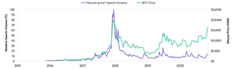 ▲比特币价格和“比特币价格”搜索量对比