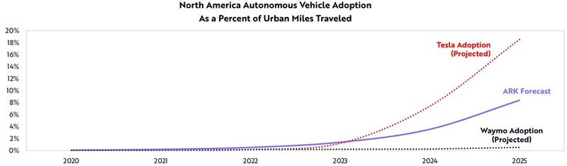 ARK认为,到2030年,自动叫车平台每年的运营利润将超过1万亿美元。拥有成功电动汽车平台的汽车制造商,与自动驾驶技术提供商合作,到2030年,每年可产生约2500亿美元的利润。