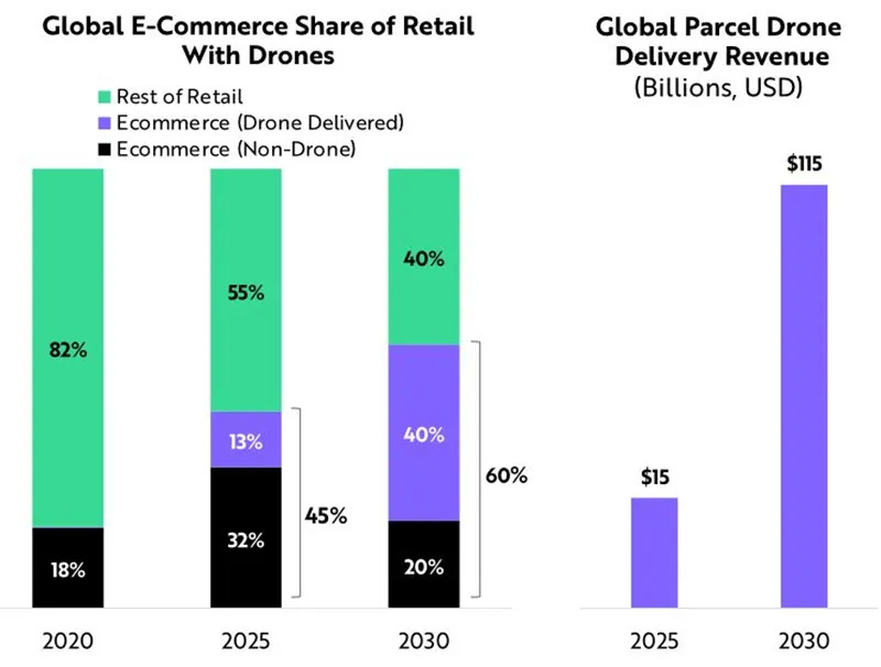 ARK公司预计,到2025年,无人机交付平台将带来近500亿美元的收入,140亿美元的硬件销售收入,以及30亿美元的测绘收入。