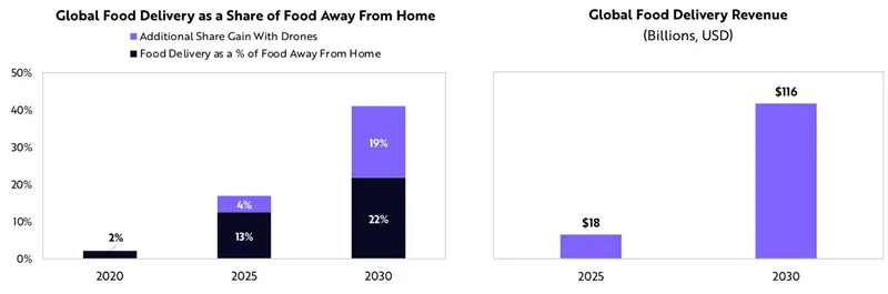 2020年,全球食品外卖销售增长超过40%。ARK公司的研究显示,在约40%的外卖食品中,无人机配送将占到近一半。