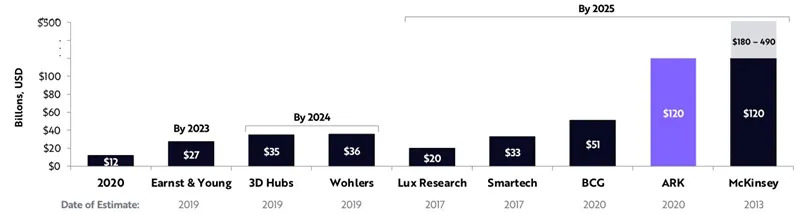 ARK认为,3D打印将给制造业带来一场革命,其年增长率约为60%,从去年的120亿美元增长到2025年的1200亿美元。