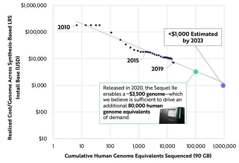 ARK预计,到2025年,LRS市场将以每年82%的速度增长。ARK相信,由于测序成本的降低以及对高精度和完整结果的需求,LRS的需求正在达到一个拐点。