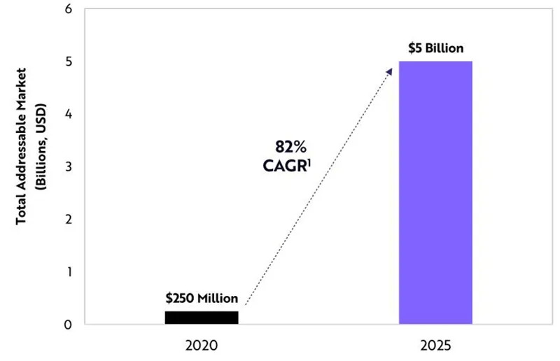 ARM估计,该公司的长期收入将以每年82%的速度增长,从2020年的2.5亿美元增长到2025年的50亿美元左右。