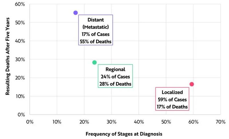 所有实体肿瘤都遵循一条可预测的路径,从局部可治疗到转移和致命,这为早期发现提供了基础。转移性癌症仅占新发病例的17%,但在五年的癌症死亡病例中占55%。局限性癌症的加权平均5年生存率是89%,而转移性癌症的加权平均5年生存率只有24%。
