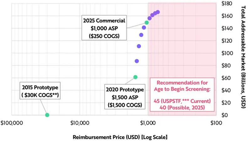 虽然1500美元的单价可以打开市场,但1000美元的单价可能会改变癌症死亡率曲线。创新技术之间的融合使多种癌症筛查的成本下降了20倍,从2015年的3万美元降至今天的1500美元,到2025年再下降80%至250美元。