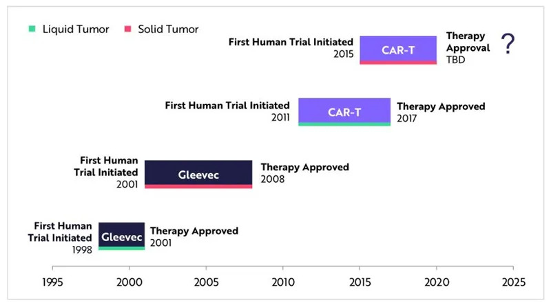 通常,癌症疗法首先在液体肿瘤上进行测试。然而,实体肿瘤占确诊癌症的88%。经过10年的试验,美国食品和药物管理局(FDA)批准了口服化疗格列卫(Gleevec),其中7年用于实体肿瘤。这条时间表表明,FDA可能会在2025年批准首个用于实体肿瘤的CAR-T疗法。