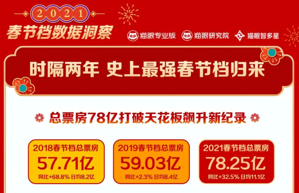 2021年春节档正式收官,总票房78.25亿元,同比增长32.5%,日均票房11.1亿元,更是创造了连续五天大盘票房过10亿的纪录。在春节和情人节的双重刺激之下,2021年中国电影市场总票房已经跑步破百亿。