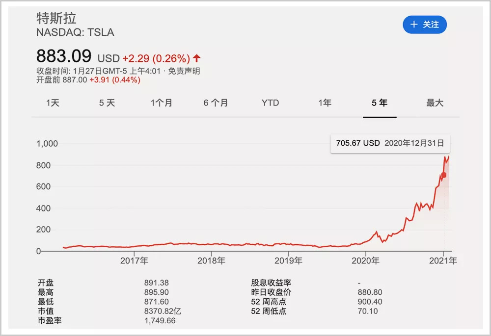 过去一年,特斯拉股价上涨了8倍,市值也从不到1000亿美元冲至8000多亿美元,成为全球历史上市值最高的汽车企业,且远超排在第二位的传统汽车大厂丰田。如果把时间拉长至10年,特斯拉从上市至今股价翻了60倍,超过苹果、亚马逊等任何一家科技大公司的涨幅。