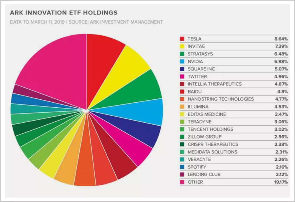 命中特斯拉让凯瑟琳一战成名,但这不是偶然事件。凯瑟琳有自己一套完整的投资逻辑和公司运营方式,在她的投资组合中,都是类似特斯拉这样的成长股,她将这些公司定义为“行业破坏者”。具有颠覆式创新和改变世界的能力,也是她衡量一家公司值不值得入手的核心标准。