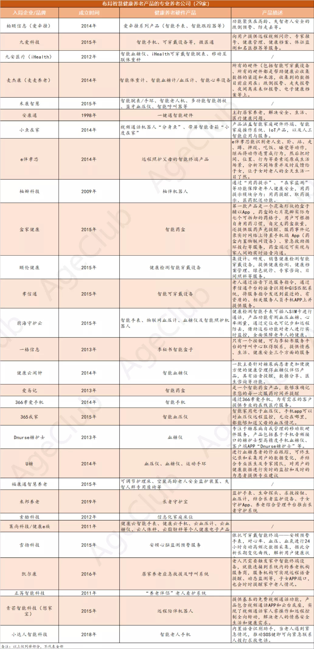 1)从市场参与企业类型来看,有三类企业较为典型,分别是:京东、华为等IT/互联网巨头,麦麦养老、e伴孝芯等智慧养老创业公司,千山药机、鱼跃医疗、南京新百等传统企业。