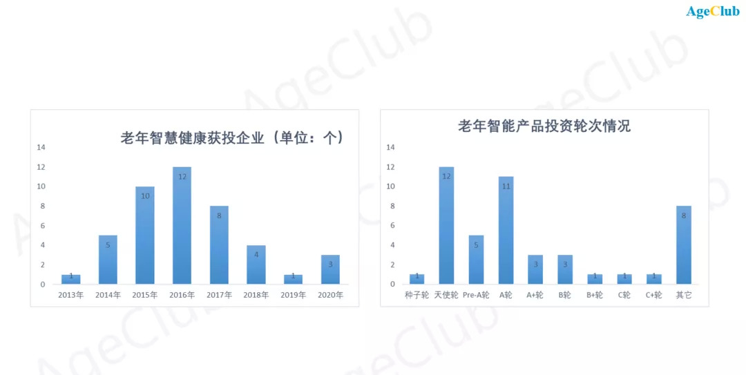 Ageclub认为,形成这一特点的原因是,自2013年开启养老元年后,创业者经过两三年的时间在智能领域成功打造出产品,吸引资本在2015年集中入场。但老年健康智能硬件行业准入壁垒较高,智能健康养老行业投资回报期较长,导致2018年开始,资本市场稍显冷淡。