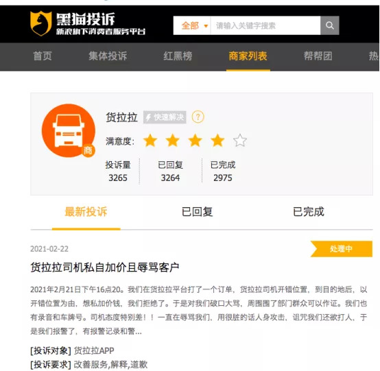 除了上述骚扰用户、乘客跳车身亡等安全隐患,货拉拉还存在货车拉客、私自加价、辱骂乘客、货物受损等众多问题。在黑猫投诉上,相关投诉超过3000个。