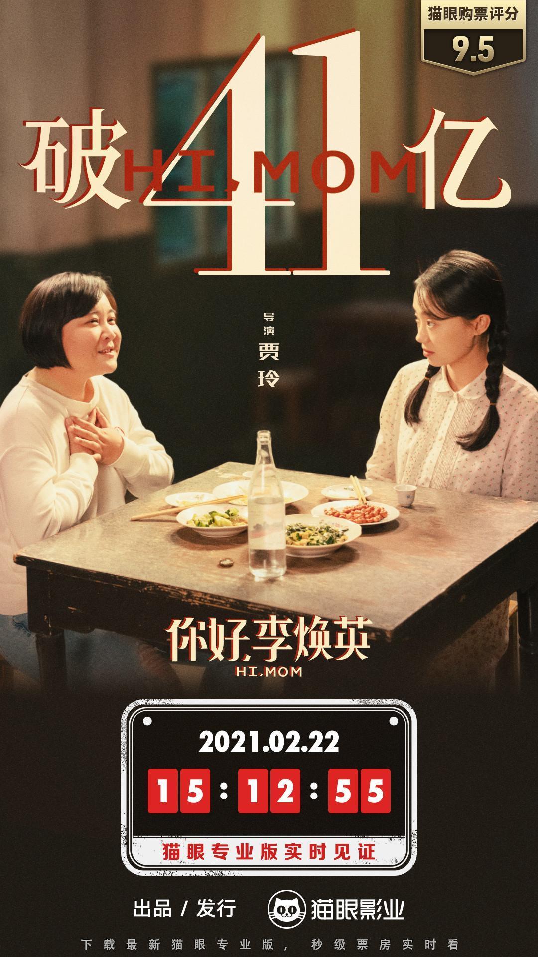 据@猫眼专业版 微博消息,截至2月22日15:12:55,电影《你好,李焕英》总票房破41亿。