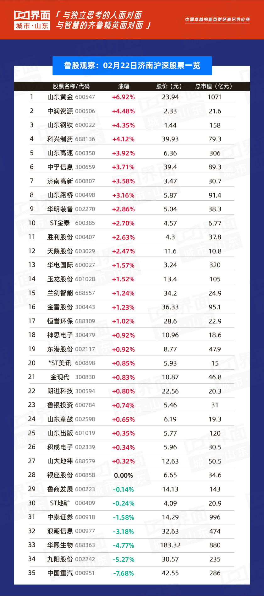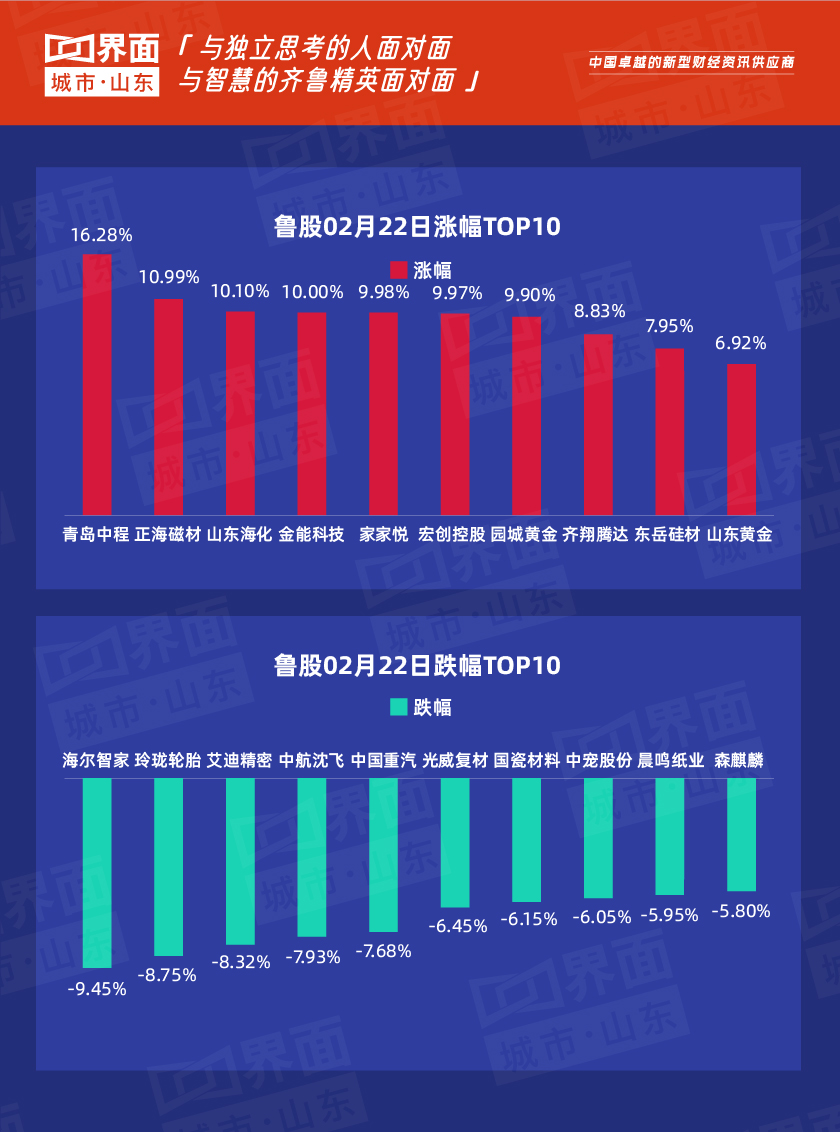 受大盘影响,2月22日,山东省内沪深股票有149只个股上涨,71只下跌,青岛中程领涨。