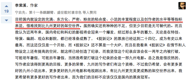 曾担任《九州幻想》执行主编的骑桶人(李棠溪)也在问答网站知乎上表示,近两年来,国内奇幻和科幻的影视将会迎来一个爆发。而目前国内就设定的完满、东方化、严密、粉丝的粘合度、小说的丰富程度以及创作者的水平等等指标来说,很难找到比九州更好的架空世界。
