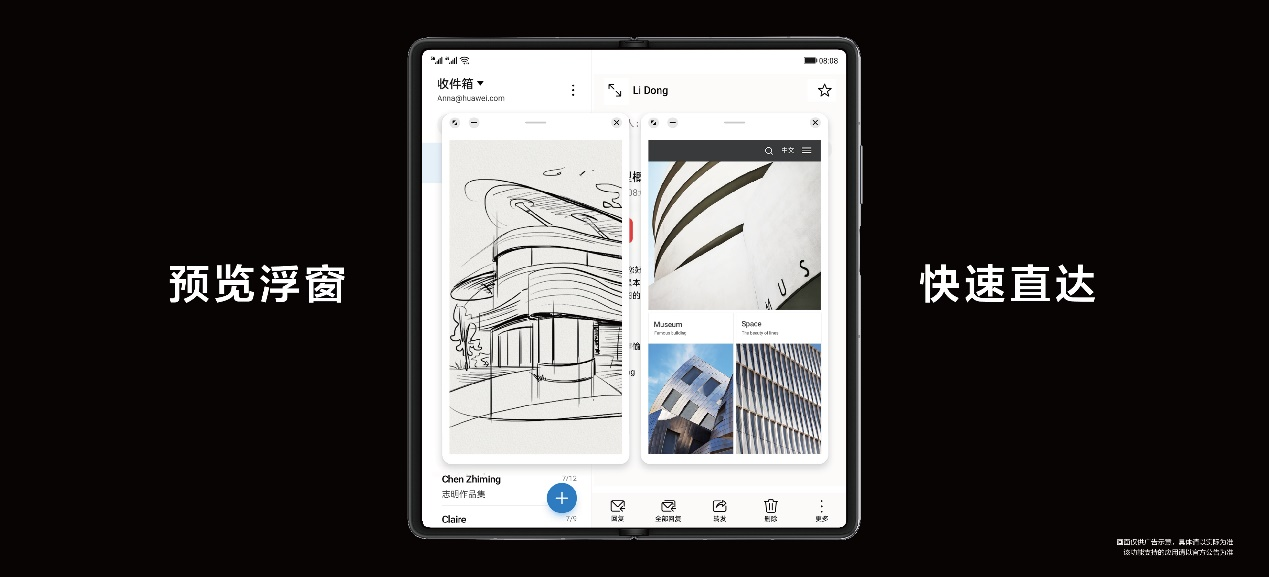 应用方面,华为Mate X2支持单应用多任务处理,便捷拖拽分享、悬浮多窗口处理等,优化了办公场景的使用体验。此外,Mate X2还提供了一些创新功能,包括看视频时的多视角切换,自由视角切换等,不过此功能暂时只支持其合作方,比如华为视频、咪咕视频、优酷视频等。