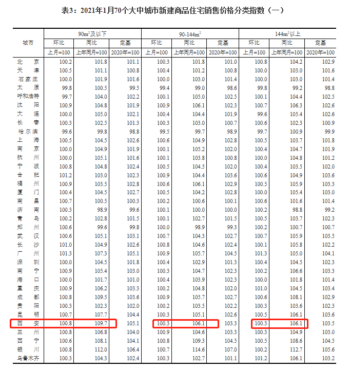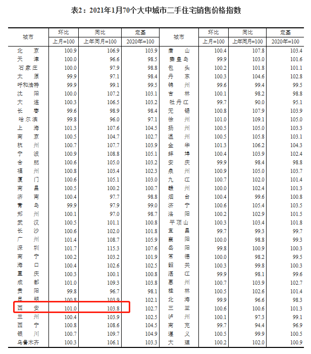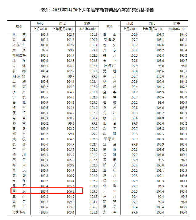 2月23日,国家统计局发布《2021年1月份70个大中城市商品住宅销售价格变动情况》,界面楼市西安频道从相关数据了解到,北京、上海、广州、深圳新建商品住宅销售价格指数环比上涨0.5%、0.6%、1.0%、0.3%。二手住宅销售价格分别环比上涨0.9%、1.3%、1.4%和1.7%。