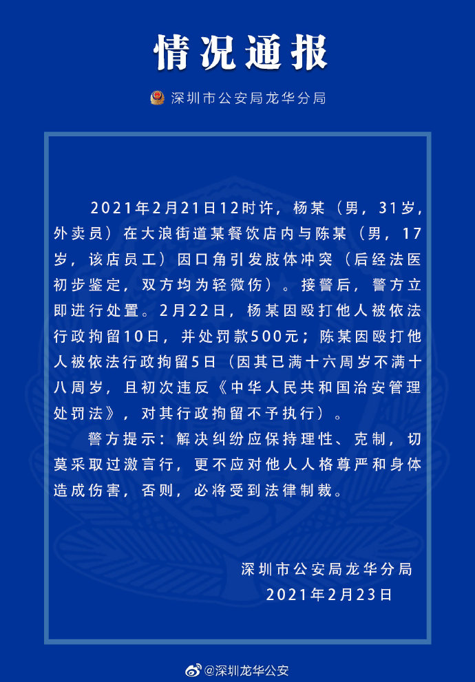 据@深圳龙华公安 23日通报,2月21日12时许,杨某(男,31岁,外卖员)在大浪街道某餐饮店内与陈某(男,17岁,该店员工)因口角引发肢体冲突(后经法医初步鉴定,双方均为轻微伤)。接警后,警方立即进行处置。2月22日,杨某因殴打他人被依法行政拘留10日,并处罚款500元;陈某因殴打他人被依法行政拘留5日(因其已满十六周岁不满十八周岁,且初次违反《中华人民共和国治安管理处罚法》,对其行政拘留不予执行) 。
