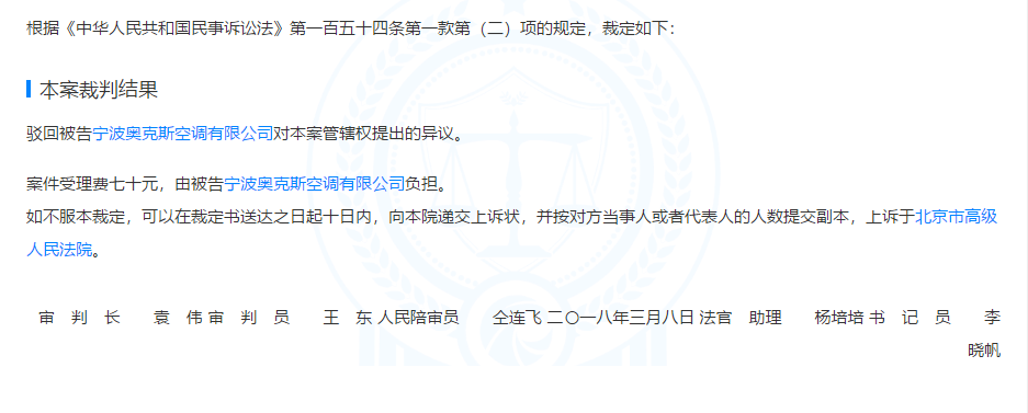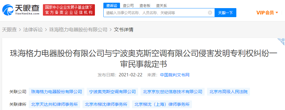 据天眼查APP显示,2月22日,珠海格力电器股份有限公司与宁波奥克斯空调有限公司侵害发明专利权纠纷一审民事裁定书公开。案号为(2018)京73民初13号,原告为珠海格力电器股份有限公司,被告为宁波奥克斯空调有限公司、北京京东世纪信息技术有限公司。本案裁判结果为:驳回被告宁波奥克斯空调有限公司对本案管辖权提出的异议等。