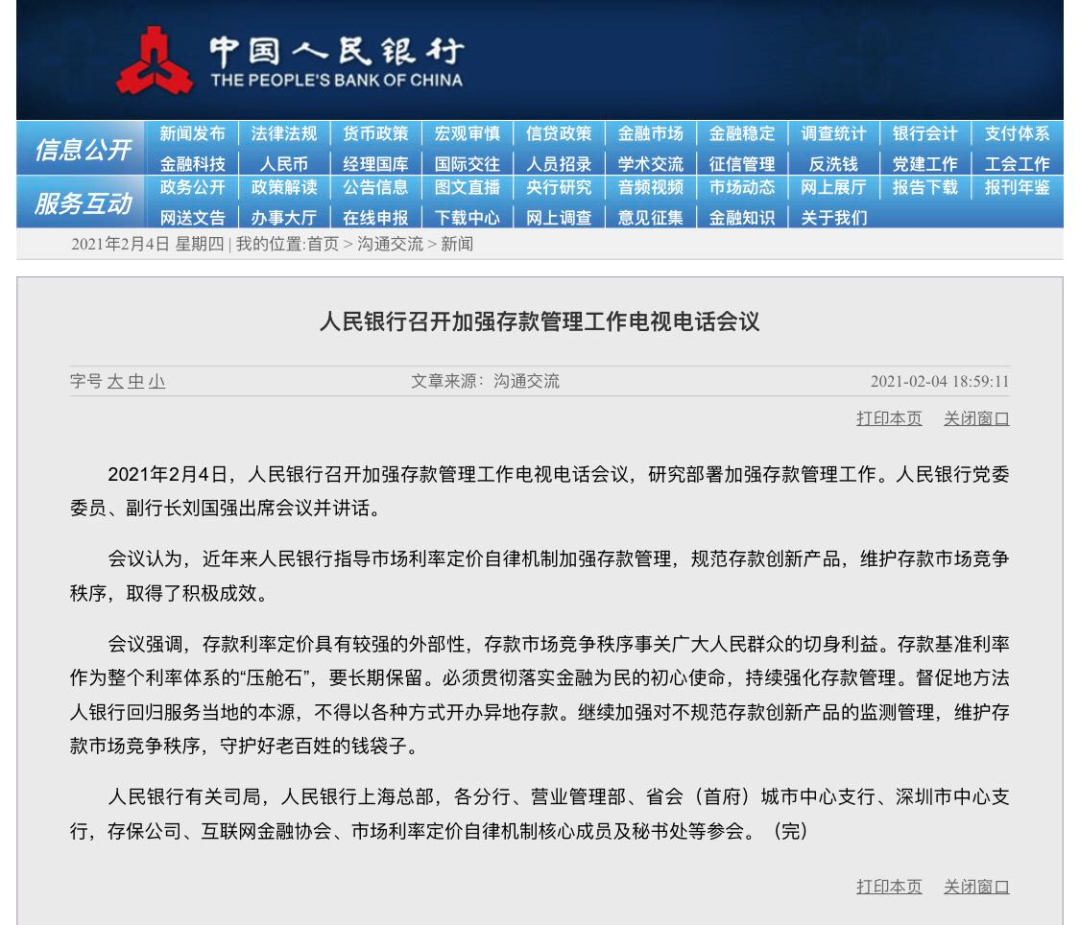 央行在2月4日的电视电话会议中明确,督促地方法人银行回归服务当地的本源,不得以各种方式开办异地存款。此前,支付宝、京东金融和度小满等平台已经彻底下架了互联网存款,购买并持有产品的老用户也无法再复购。
