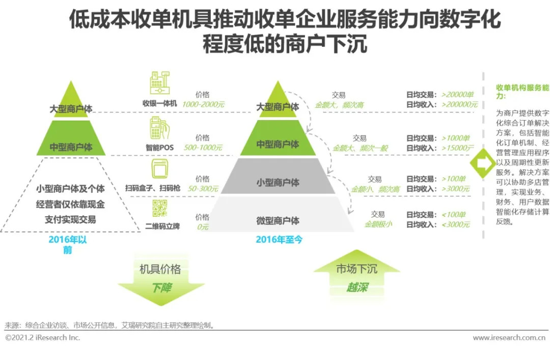 2015年,支付宝、微信通过在线下消费场景中布放二维码,在移动支付领域取得成功突破。由于支付宝、微信的用户市场教育卓有成效,同时得益于移动支付自身优势在零售行业的发挥,非现金支付模式成功打破了城市等级、消费水平、地域差异等限制,从一二线城市向三四线乃至更偏远的农村乡县覆盖。从需求端来看,收单机构作为条码支付链条上的重要一环,可借由条码支付通道快速触达下沉市场商户需求。从供给端来看,得益于条码支付普及以及移动端设备进步,收单机具的硬件成本底线大幅下降。二维码立牌、扫码盒子、扫码枪等低成本收单机具帮助收单机构撬动下沉市场中小微商户体的数字化服务需求,进而为收单机构数字化服务能力输出夯实基础。