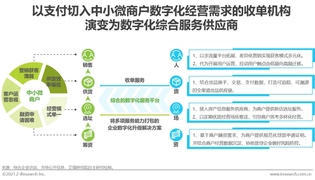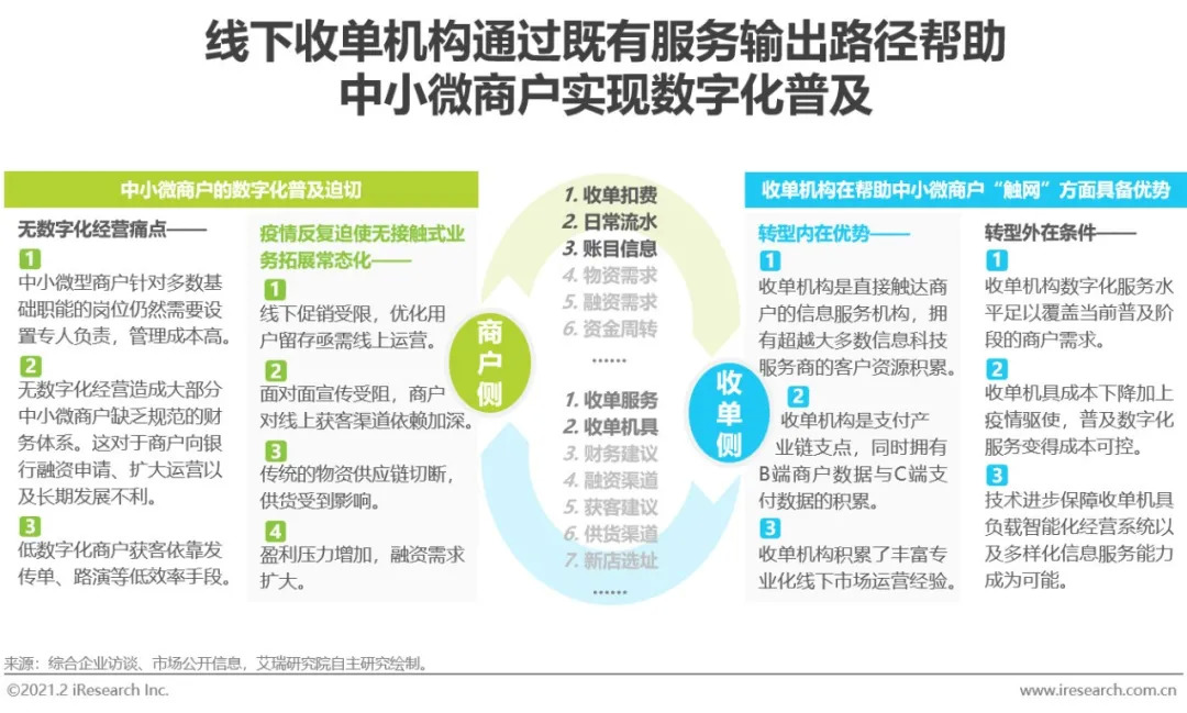 在商户侧,受疫情驱动,“支持无接触支付”、“线下转线上”成为商户经营的必要条件,2020年以来越来越多的中小微商户通过非现金支付通道实现触网。而中小微商户的数字化经营之路并不止于接入数字化平台,大部分中小微商户存在线上获客能力薄弱、经营模式单一、忽视用户运营、货品供应效率低等短板。为避免新的运转模式致使经营陷入困境,中小微商户亟需专业化的团队辅助完成传统经营模式向数字化经营模式的过渡。
