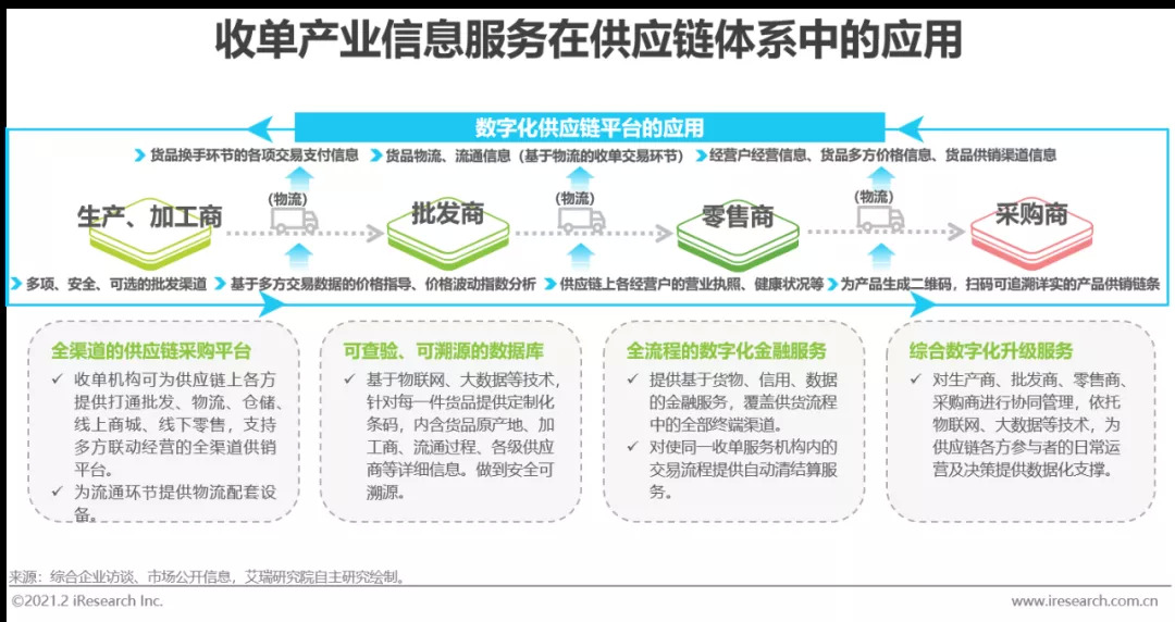 随着产业支付的深化,收单业务在商户群体中的渗透由零售商向生产商、加工商、批发商、采购商延伸,基于产业支付的线下收单市场份额已初具规模。从客户需求侧来看,传统的货品供销体系存在交易数据繁杂、统计失误几率高、货物及数据溯源难度大等弊端,而零星环节采用数字化管理仍不能解决以上关键问题,对整个货品供销流程的效率提升贡献有限。目前下游商家对于全链数字化升级的需求最为迫切。从服务供给侧来看,收单机构基于为批发商、零售商、采购商提供的收单服务,沉淀了大量经销流程的交易数据,这些数据在收单机构的统筹管理下,可以大幅减少差错、精准溯源。此外,收单机构可将交易数据与货品、物流匹配,结合DNS标识解析等工业互联网技术,对全部的供销链条进行数据化管理,打造全流程可溯源、全方位可查验、全渠道一站式货品供应链平台。