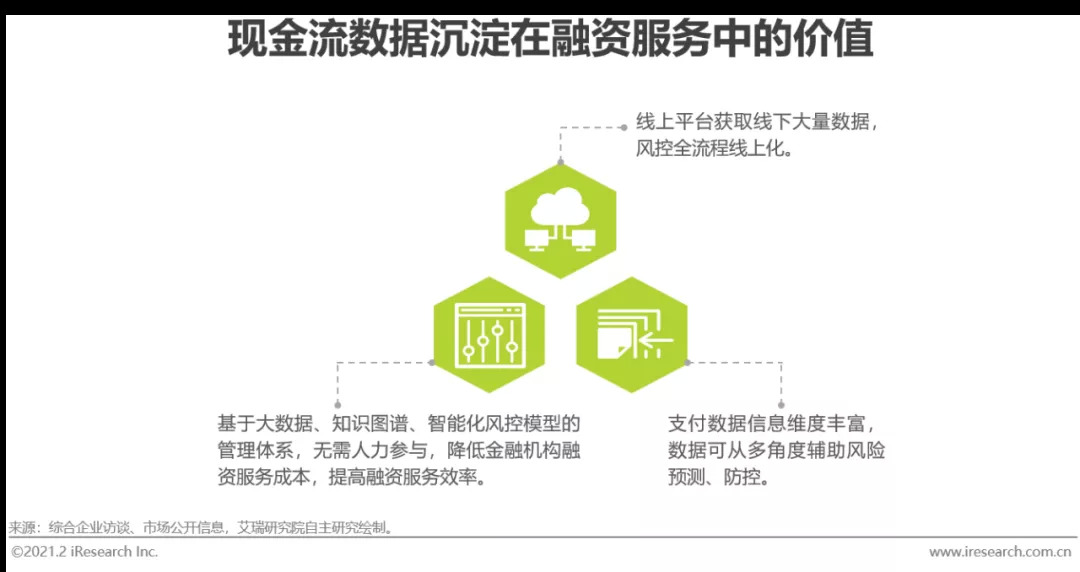 中国中小微商户群体普遍存在企业财务报表不规范、账目混乱的问题,造成中小微商户“融资难”现象。提供贷款服务的金融机构在审核中小微商户贷款融资申请时往往会耗费更多的人力、时间完成尽调工作,造成金融机构提供融资服务的成本上升,进一步加剧中小微商户融资困难。化解中小微商户融资困境,完整、明晰、规范的关键数据必不可少。具体而言,金融机构提供融资服务前,需要借助详实的企业数据来探察融资对象的真实情况,衡量可贷资金的量级的同时做好风险预防。而收单机构所掌握的恰恰是与中小微商户现金流状况息息相关的、可直接反映中小微商户偿债能力的交易支付数据,是金融机构的核心关注点。因此,收单机构基于长期商户资金流数据沉淀,可以为商户提供“助贷”服务。收单机构一方面可帮助有融资需求的中小微商户联系融资渠道、整理递交规范性融资申请文件,另一方面可协助金融机构梳理、核准关键性商户经营数据,以多维度的支付信息降低金融机构风控负担。