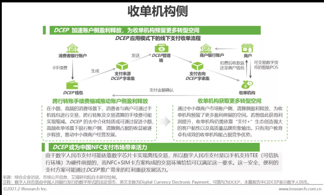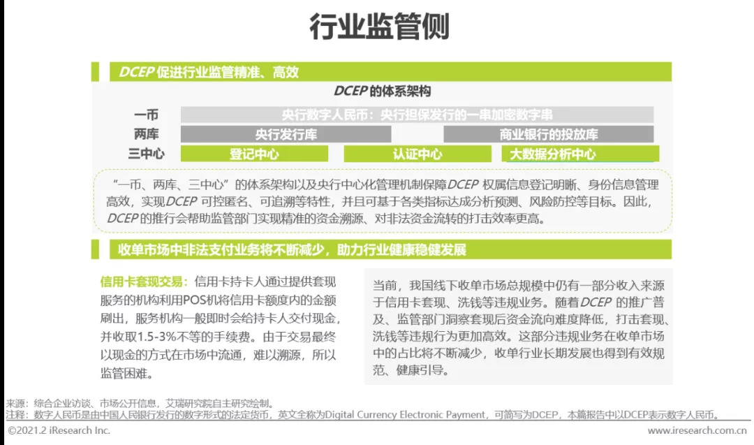 DCEP将助力监管打击收单市场中套现、洗钱等违规业务,并为市场参与者提供更多转型空间,优化支付产业链运行规则