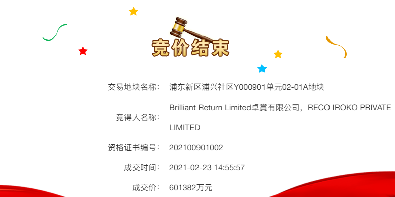 2月23日,上海浦东新区一幅商住办综合用地进入现场竞价,嘉里建设与GIC(新加坡政府投资公司)联合体与陆家嘴集团联合体参与竞拍。最终嘉里建设与GIC联合体嘉里建设60.1382亿元成功竞得该幅地块,价率0.2%。