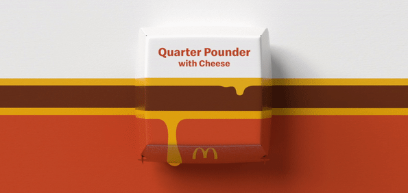 芝士汉堡则通过色块的叠加,模拟了产品的内部构造:芝士+牛肉+芝士,更有心机的是,还刻意把芝士往下流淌,让人光看包装就联想到内部热腾腾的芝士香。