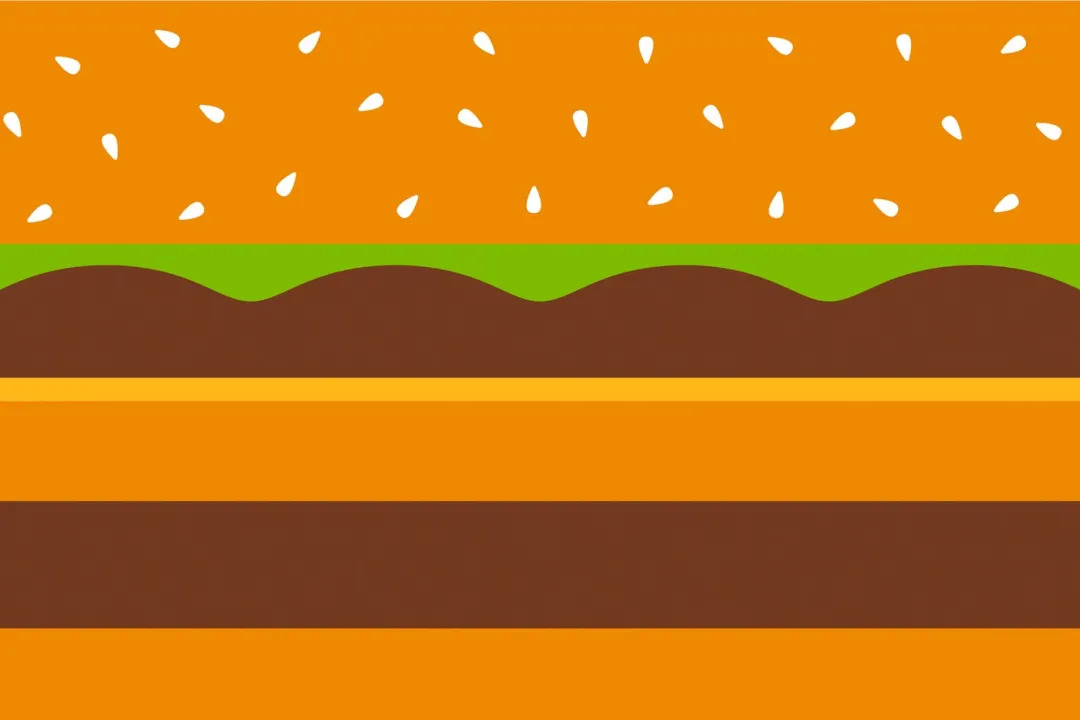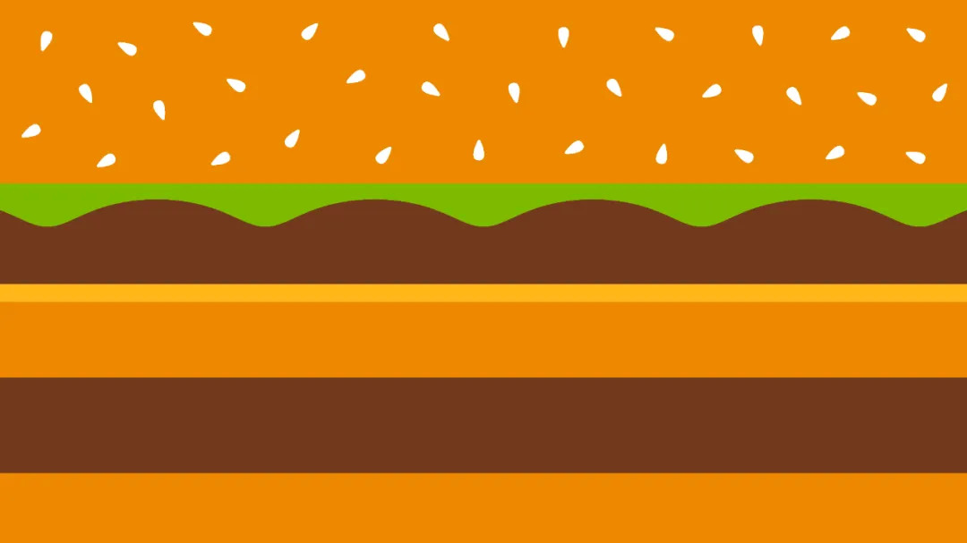 作为最知名的巨无霸,也是采用扁平风的色块叠加形式,从图案就能看到:芝麻面包饼+蔬菜+牛肉+芝士这些内部食材,而多层叠加也告诉了消费者产品内部有多丰富。