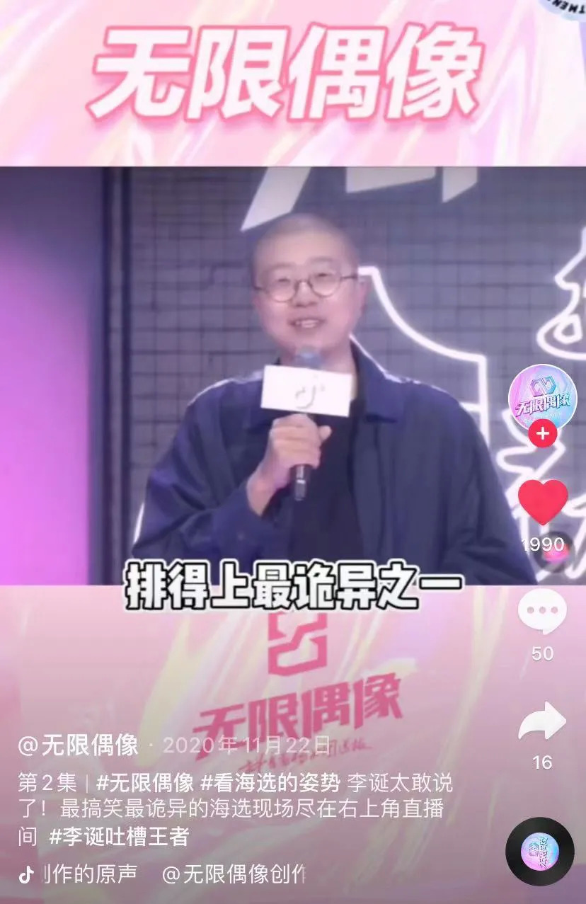 2020年上线那一批短视频选秀综艺,《无限偶像》应该是最有卖相的一个。李诞、汪苏泷、杨天真等导师虽非顶配,但胜在自带网感,适合抖音用户的口味。参赛选手自带粉丝动辄百万、千万,也让平台有勇气喊响“天生偶像,无限发光”的口号。