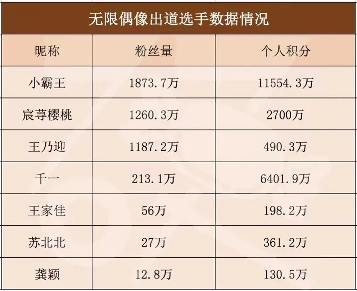 至于短视频选秀的公平性,其实更难保障。《无限偶像》采用榜单积分制,由粉丝投票、真人秀积分、导师加成综合计算。小霸王、王乃迎和宸荨樱桃的粉丝量高达数千万,以绝对碾压的优势分走三个出道位。谁自带粉丝多,谁就能出道。马太效应这么强,还选秀干嘛?