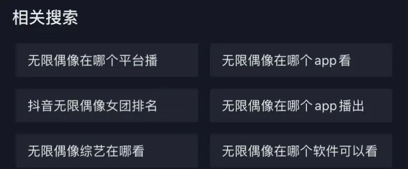 在站内,抖音没有综艺专区供节目进行集中曝光。观众需要自行搜索或关注官方账号,转化链条过长。在抖音搜索“无限偶像”,相关搜索竟是“在哪看”,心疼一秒。