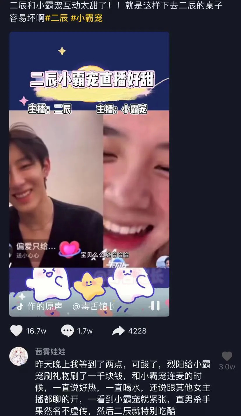 比如著名的“抖音三角恋”。纯情女主小霸宠恋上宠溺男主二辰,霸道男二烈阳中途截胡。男女、男男并线发展的剧情,让人无比上头。三人隔三差五连麦发糖,及时更新各种恋爱物料。