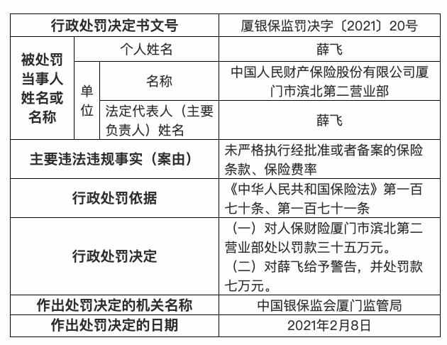 2月23日,厦门银保监局发布的行政处罚信息公开表显示,因未严格执行经批准或者备案的保险条款、保险费率,中国人民财产保险股份有限公司厦门市滨北第二营业部被厦门银保监局处以罚款35万元;薛飞受到警告,并处罚款7万元。