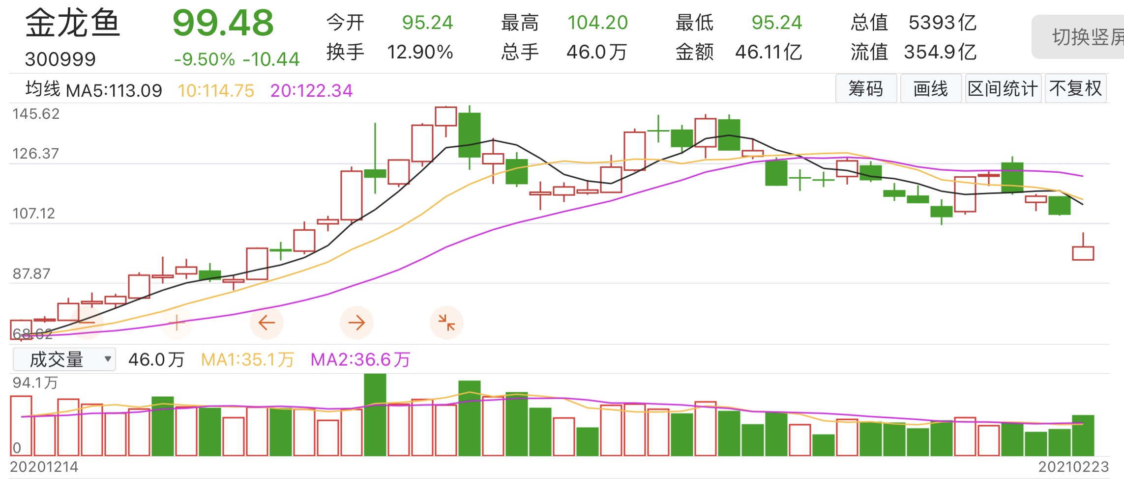 金龙鱼(300999.SZ)的股价也“崩”了。2月23日收盘,该公司股价“失守”百元关口,大跌9.5%至99.48元/股。