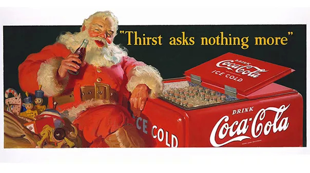 冰凉清爽的可口可乐是典型的周期性产品,通常夏天热销,冬天的销量会直接下降。在这个方面可口可乐也曾数次投放广告,可效果却平平。直到1931年,可口可乐选中的圣诞老人明显为可口可乐当年的销量做出了巨大贡献——可口可乐公司开始把圣诞节当作一个关键的营销节点来看待。全家人聚集在一起,分享彼此快乐的圣诞节刚好契合“快乐”这一可口可乐努力打造的品牌符号。因此,可口可乐与艺术家海顿·珊布(Haddon Sundblom)签约,共同创造出一个喝可乐的圣诞老人形象。