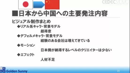 在去年九月日本举办的CEDEC 2020上,ゴールデンサニー董事长田村俊彦分享了这样一个情况:从中国到日本的角色设计和剧本的订单正在不断增加,特别是角色设计方面。“中国的角色设计大多数头和身体都比较高,转化成二次元画风的话比较困难。中国对日本的要求是2D角色设计,在这个领域日本还处于中国的前列。剧本有时也会向日本订购。在中国,例如《三国志》、《水浒传》等以古典小说为基础的剧本很多,在游戏中很难表现出独特性和创意性,这时日本人的创意就能被运用其中。”