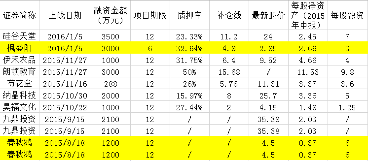 值得指出的是,枫盛阳项目每股融资3元,其2015年中报每股净资产2.69元,春秋鸿项目两次补仓后相当于每股融资2.7元,但其中报每股净资产仅0.37元。