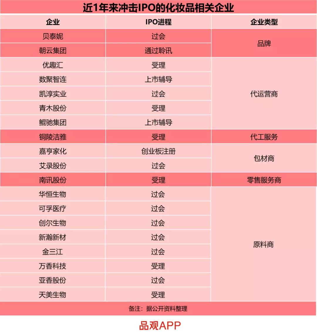 同时,很多企业也在冲击IPO,争取上市的机会。据不完全统计,近1年来,除已上市的企业外,其他冲击IPO的化妆品相关企业不少于20家,其中,已经过会的就有10家左右(见下表)。